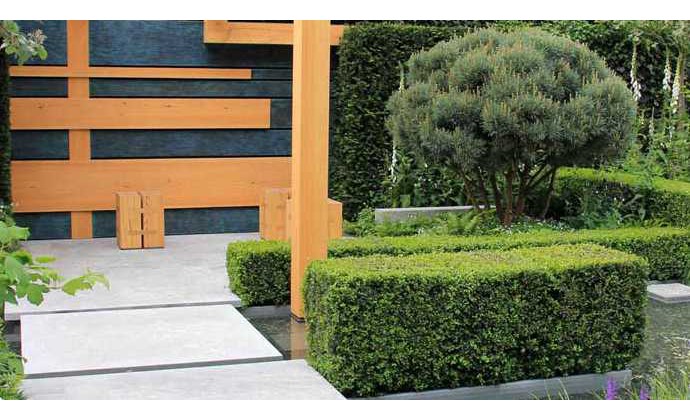 Hlavnú rolu záhrady dostala Borovica lesná ´Watererii´ z vystihaným kmeňom a zastrihnutou korunou do gule.