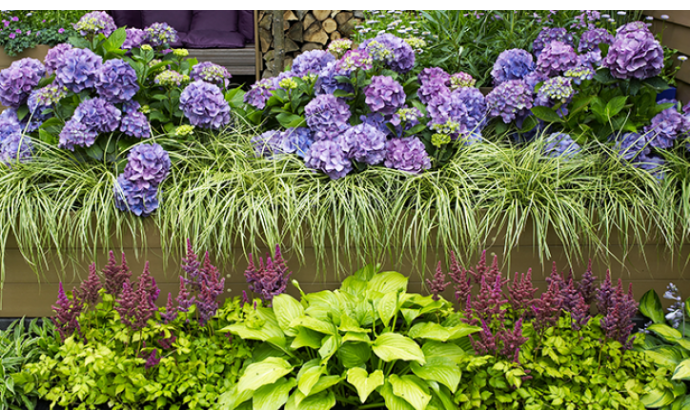 Kombinácia hortenzie kalinolistej a tráv vytvára vyplnenú plochu, ktorá je doplnená ostatnými trvalkami.