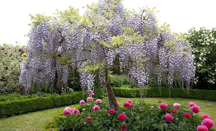Krásna popínavá vistéria sa môže pestovať aj formou stromu s korunkou.