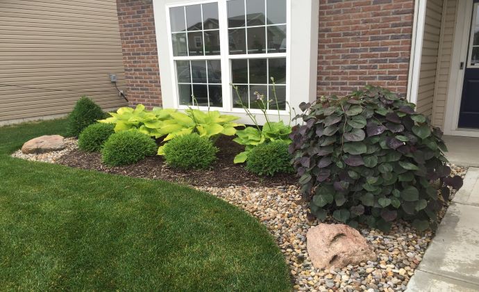 Hlavným ťažiskom daného záhonu je Javor mliečny ´Royal red´ . Listy tejto odrody sú sýto vínové, až hnedočierne, lesklé a na jeseň sa menia na jantárovú až ohnivo oranžovú.