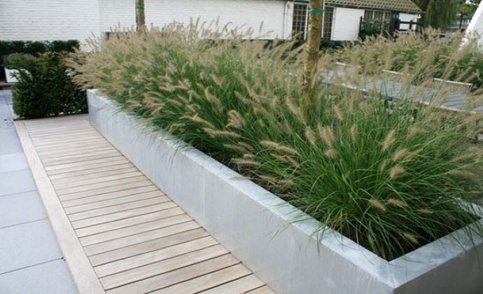 V tomto veľkom betónovom kvetináči je zasadený iba jeden druh trávy, ale o to viac vynikne.